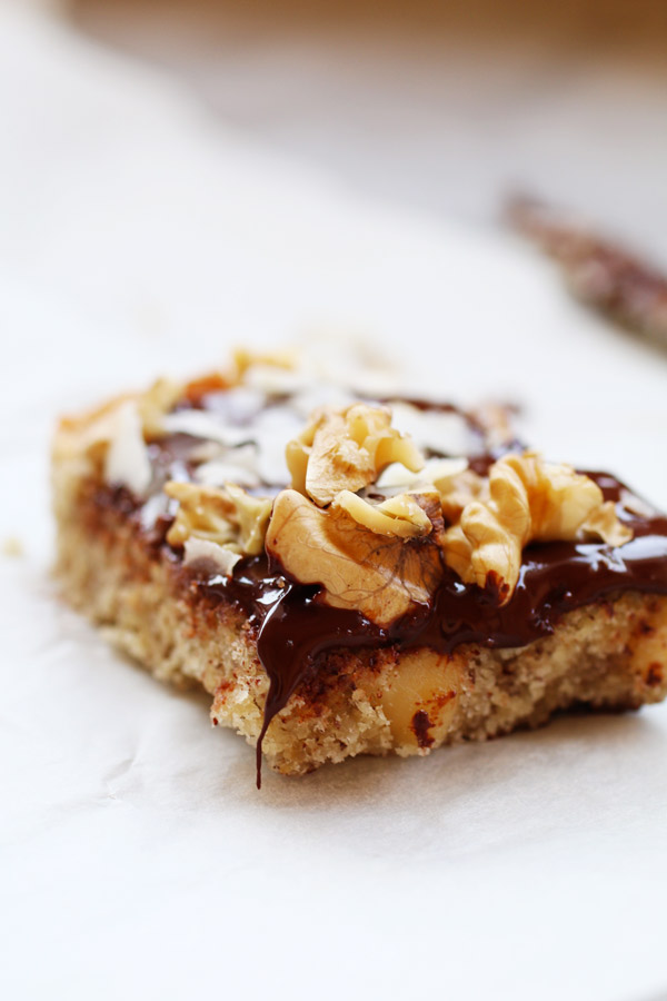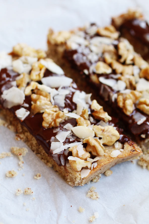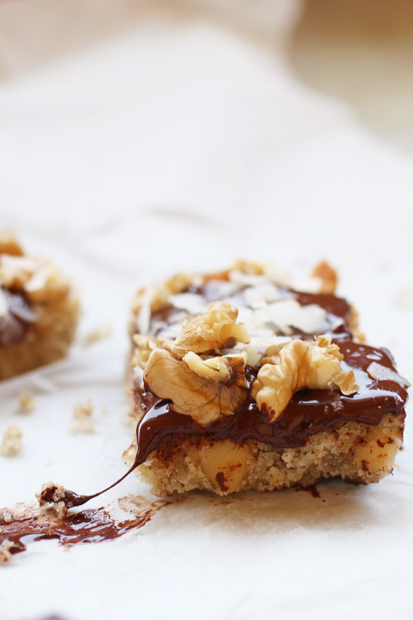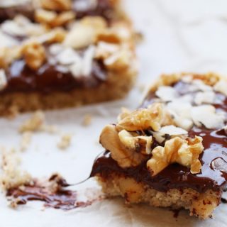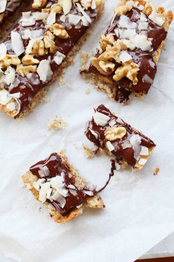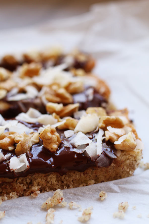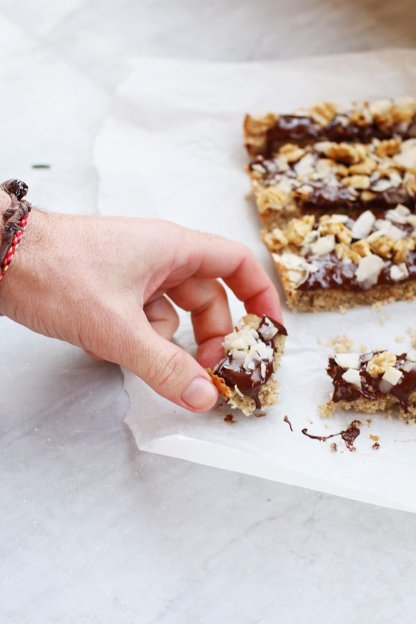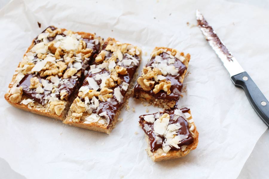 - Spezzetta con le mani i gherigli di noce e lasciali cadere a pioggia insieme alle scaglie di cocco. Attendi altri 5-10 minuti e mentre il cioccolato è ancora malleabile incidi con un coltello il biscotto in parti uguali (c. 12 pezzi).