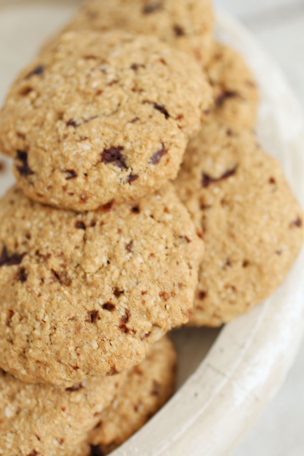 La prima grande sorpresa (positiva, ovviamente) è che i biscotti tengono una forma fantastica, anche in forno rimangono perfettamente rotondi. Forse anche per un uso leggermente maggiore di farina rispetto alle mie solite quantità, questi biscotti non tendono a distendersi nonostante l’olio di cocco e il lievito biologico (ovvero una miscela di cremor tartaro e bicarbonato di sodio). Un’altra cosa interessante è che la metà dei biscotti “test” li ho cotti a 140° C alzando la temperatura solo gli ultimi 5 minuti, la sorpresa incredibile è stata quella di trovarmi con dei biscotti davvero croccanti: hai presenti quei meravigliosi biscotti che sogni, leggermente morbidi dentro ma con un esterno che crocchia, ideali da inzuppare nelle tue bevande vegetali a colazione? Eccoli qua. Un morso di vero godimento che ti scalda il cuore in queste giornate in cui stiamo salutando l’inverno e dando il benvenuto alla primavera.