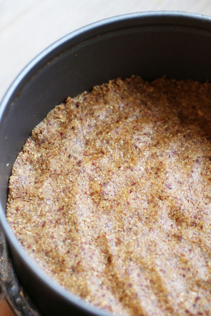 - Ricopri il fondo di una tortiera con la cerniera (diametro 18cm) con la pellicola trasparente. Inserisci il composto per la base, schiaccia bene e livella poi metti nel frigorifero.