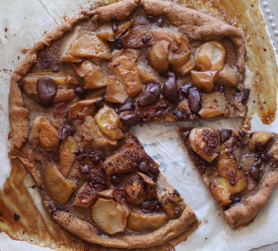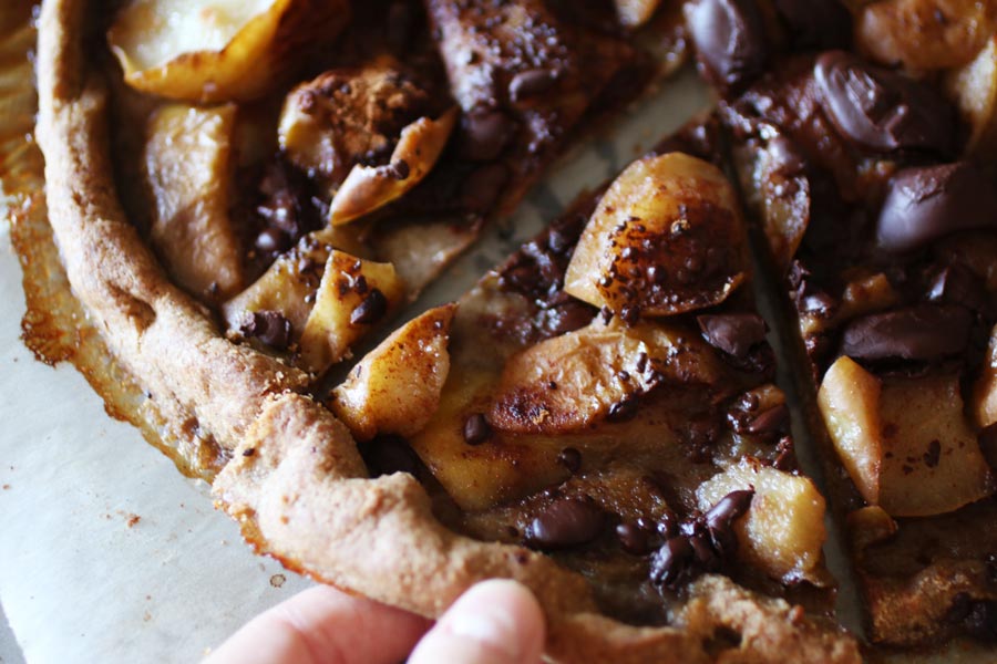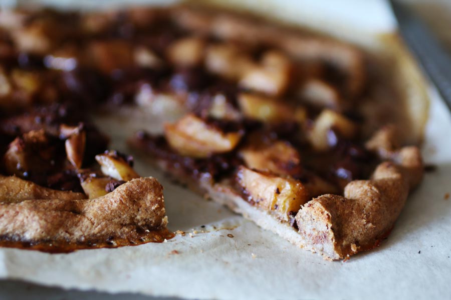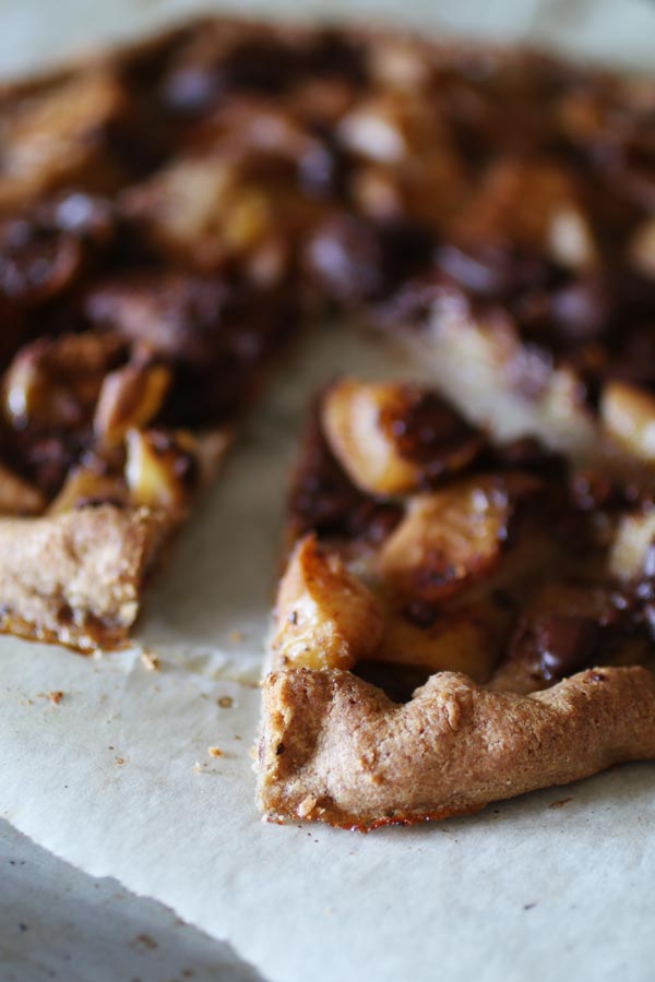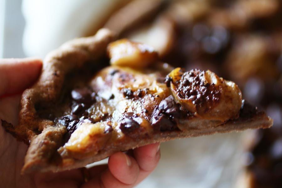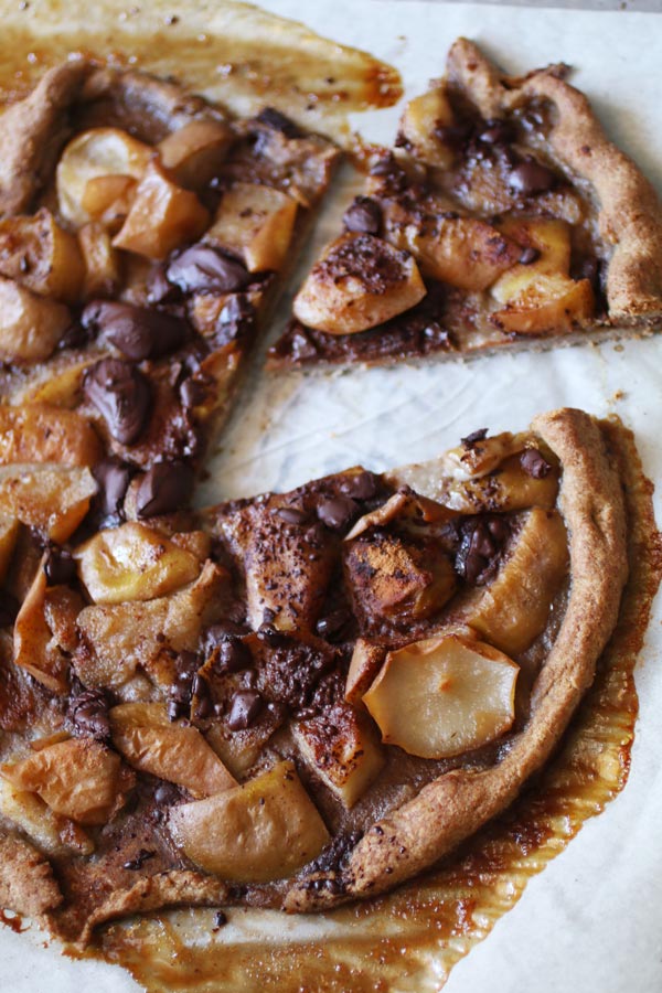 Ottima trovata! Il sale aveva aggiunto dolcezza perché si sa, il sale tende a dolcificare qualsiasi cosa amara, ecco perché sta così bene con il cioccolato. Inoltre, il ghee conferisce a questa base (che possiamo definire una pasta sfoglia super semplice) una fragranza unica che esalta ancora di più il gusto dei morbidi pezzettini di pera e di cioccolato fondente.