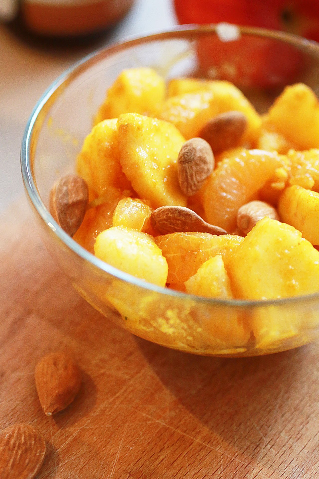 La frutta biologica è molto meno glamour rispetto a quella del supermercato. E’ naturale pertanto che dopo un periodo breve diventi macchiata e raggrinzita. Io sono solita usare le mele e le pere ammaccate per preparare composte o macedonia come questa. In pratica, per una super merenda, ti servono solo la frutta che hai in casa, le spezie colorate, una fonte di proteine e grassi buoni (mandorle nel mio caso) e un dolcificante come lo sciroppo di yacon (che stimola le difese immunitarie e regola l’intestino) oppure la stevia naturale in polvere.