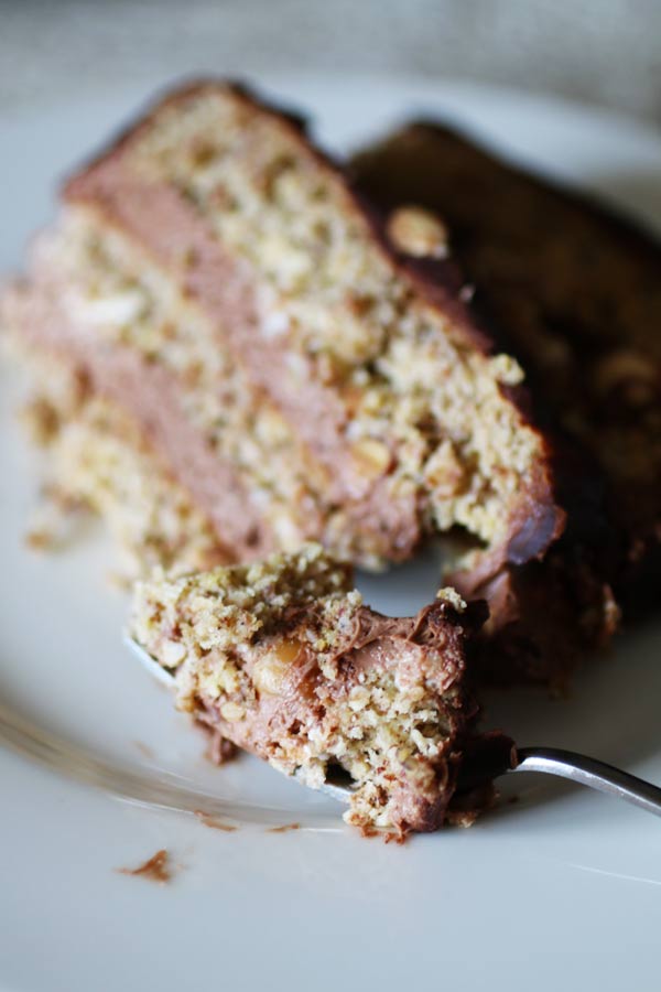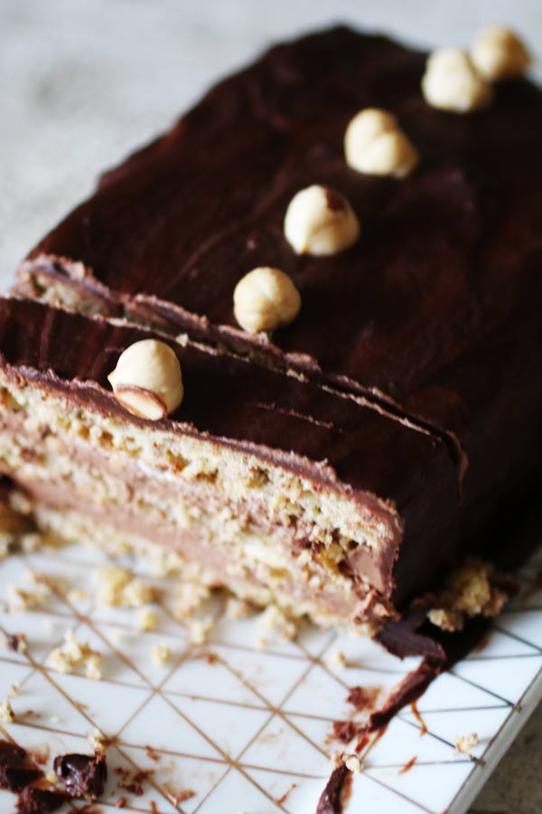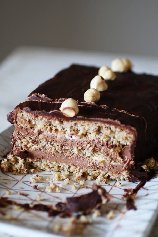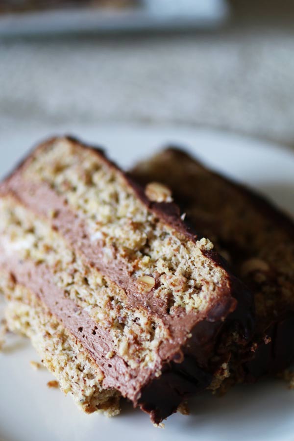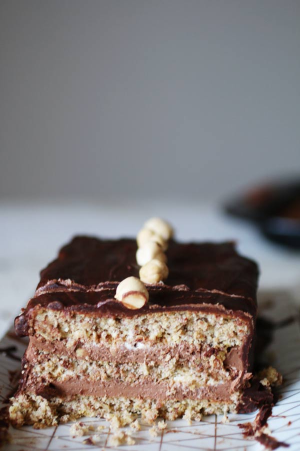 Come dicevo, una torta a sei strati (sì, tre strati di pan di spagna, due di crema e uno di glassa) va affrontata come un progetto di assemblaggio. Quando avrai cucinato la crema e il pan di spagna il resto è una passeggiata. Di sicuro il sapore migliorerà con il tempo, quindi prepara la tua Mattonella al Cioccolato Senza Zucchero né Farina anche due o tre giorni prima e lasciala riposare nel frigorifero.