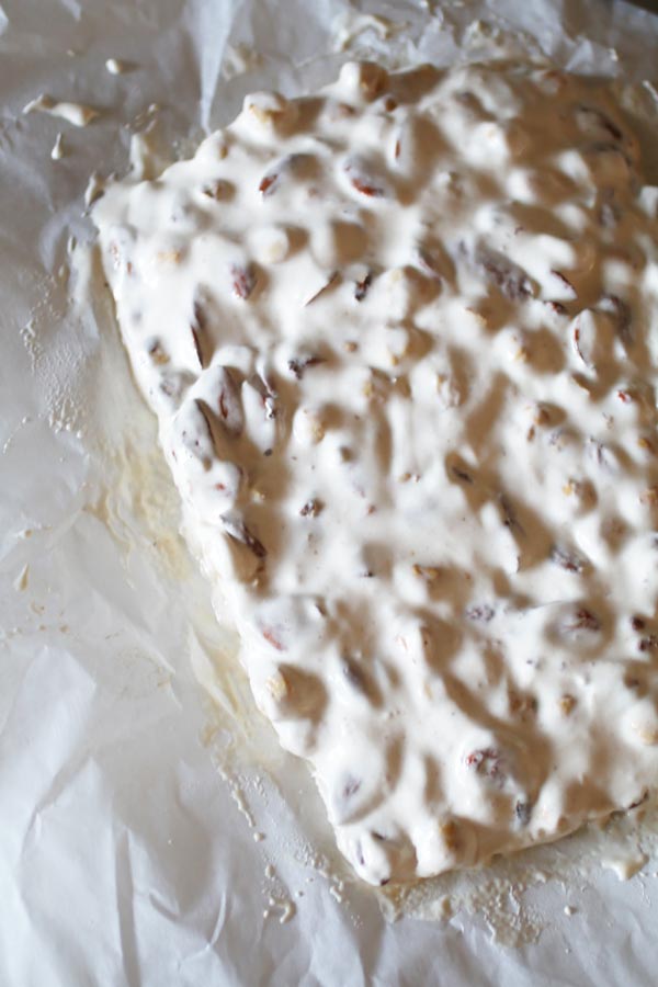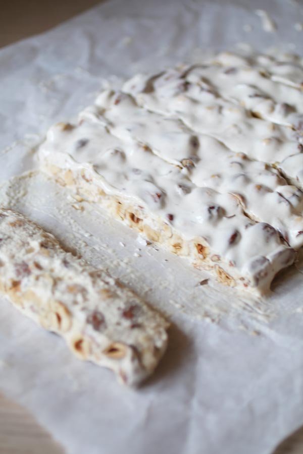 - Congela per un paio di ore per poterlo tagliare meglio nei pezzi da servire. Il torrone è molto morbido quindi è pratico servirlo tra i pezzi di carta da forno. Conserva nel congelatore, volendo. Sappi che, una volta scongelato, sarà ancora più morbido. Se decidi di servirlo congelato (non gelerà mai, anzi, avrà la consistenza del torrone più solido) attendi un paio di minuti.